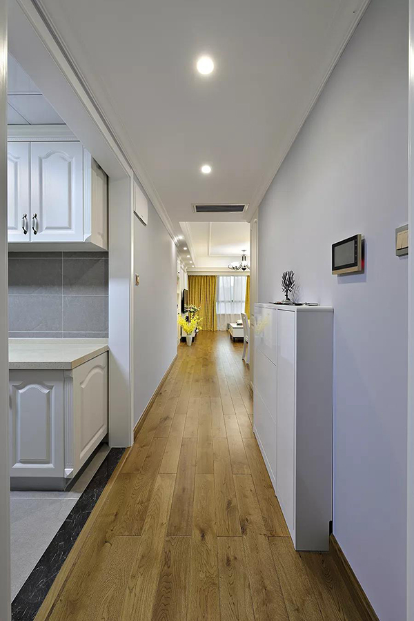 玄關(guān)處白色的小鞋柜,讓小空間具有實(shí)用的收納和裝飾功能。木地板與白色背景形成鮮明對(duì)比,整體讓人感覺落落大方,回到家就能感受到暖心的氣息。