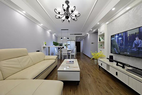 米色皮質(zhì)L型沙發(fā),溫馨舒適,易清潔,搭配白色實(shí)木茶幾,看上去就很舒服了。