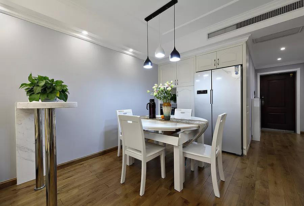 餐廳這張白色實(shí)木餐桌椅,邊角可以折疊,無論人多人少都能駕馭。白色的餐邊柜,冰箱嵌入到中間,顯得格外的優(yōu)雅端莊。