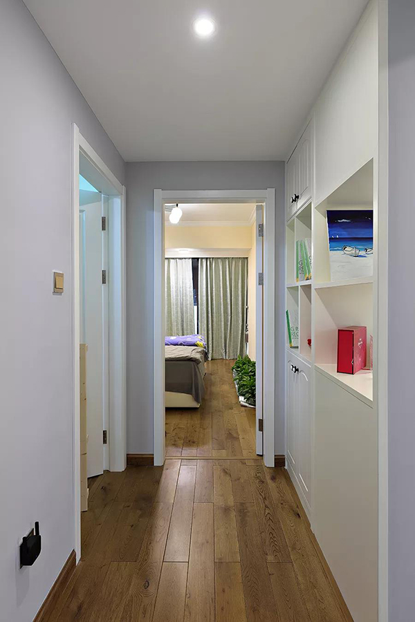 用過道空間做了入墻式的收納柜,既增加室內(nèi)的收納空間,又不妨礙活動(dòng)空間,結(jié)合復(fù)古木色與白色,讓原本單調(diào)的走廊也顯文藝愜意。