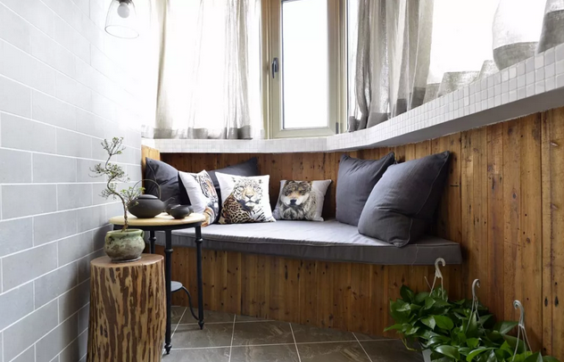 曲線環(huán)繞形的窗戶區(qū)域,簡直是家里光源的主要功勞者,木質(zhì)天花與下方木質(zhì)墻面相呼應(yīng),統(tǒng)一性與整體性讓人在這個空間中,很舒服,還有空間分割做了小臺階,