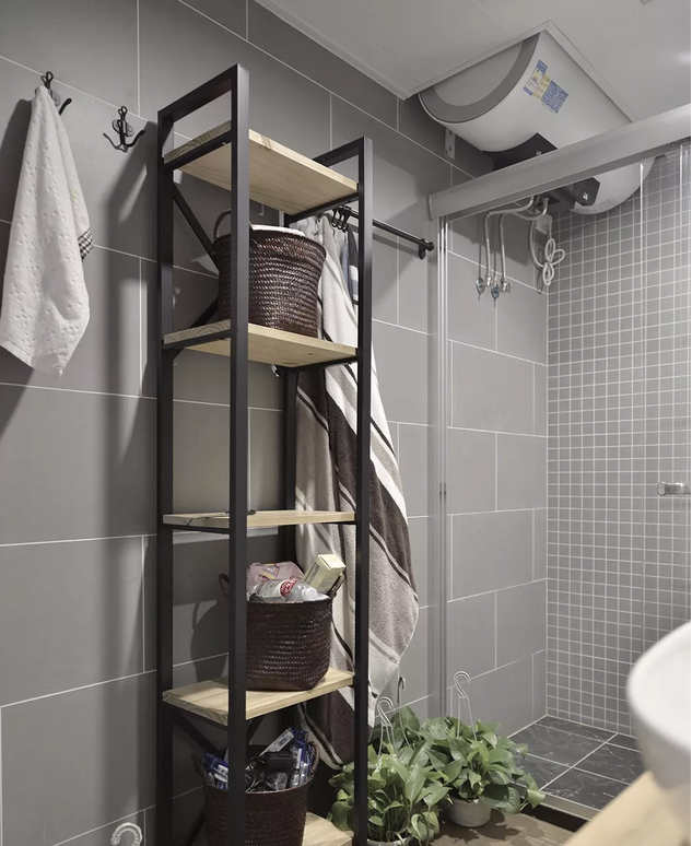 灰色調(diào)為主的衛(wèi)生間,避免純灰的單調(diào),選用了三種不同花樣不同尺寸的貼磚,顯得很有層次感。還有一個兼具裝飾與實用性的置物架。