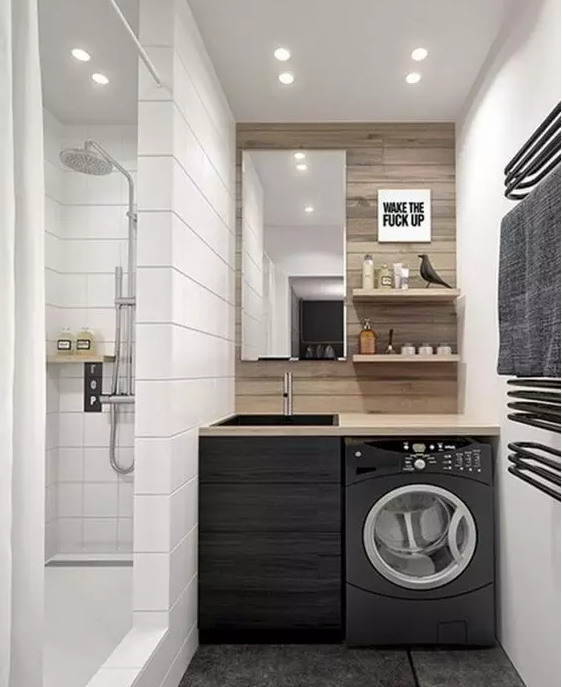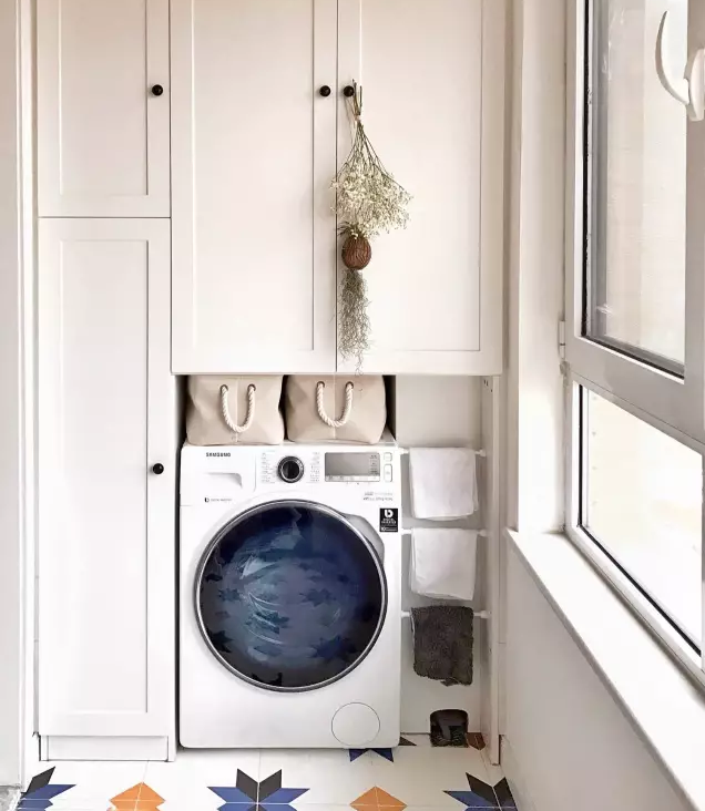 衛(wèi)生間面積不夠,或者覺得陽(yáng)臺(tái)放洗衣機(jī)比較方便的小伙伴 ,也可以考慮把洗衣機(jī)放陽(yáng)臺(tái),這樣洗完直接晾曬。