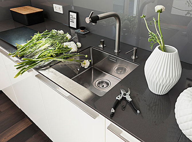 還有一個問題:不銹鋼水槽最好選擇經(jīng)過拉絲處理的,這樣不會留下手印和水漬。如果不小心選了亮面的水槽,你會發(fā)現(xiàn),水漬留下的圈印兒是不管沖多少遍都沖不掉的,除非每天都用鋼絲球處理。
