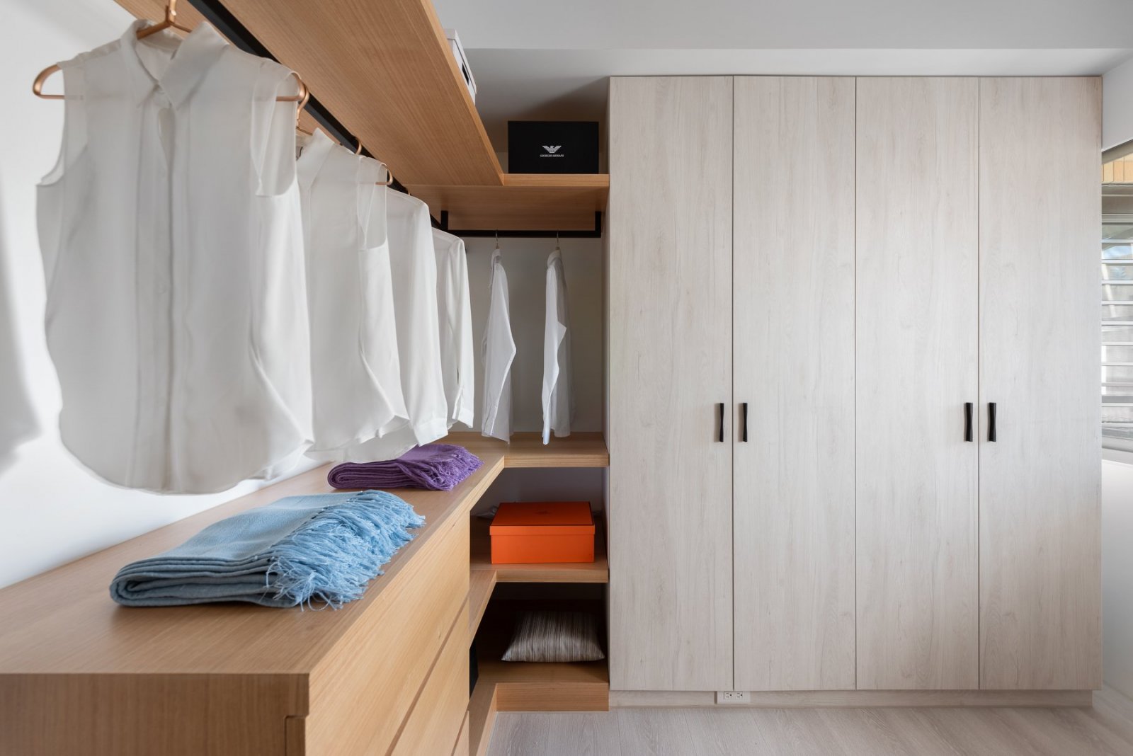 空間利用與使用比率一般有兩種,一種是建筑本身分割出來的,一種是通過自己或設計師,重新分割空間劃分出來的,實際上后者在空間上并不需要大,夠用就行。不常穿的衣物,不要占用空間,這是流動空間的優(yōu)化體現(xiàn)。