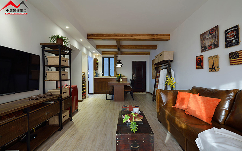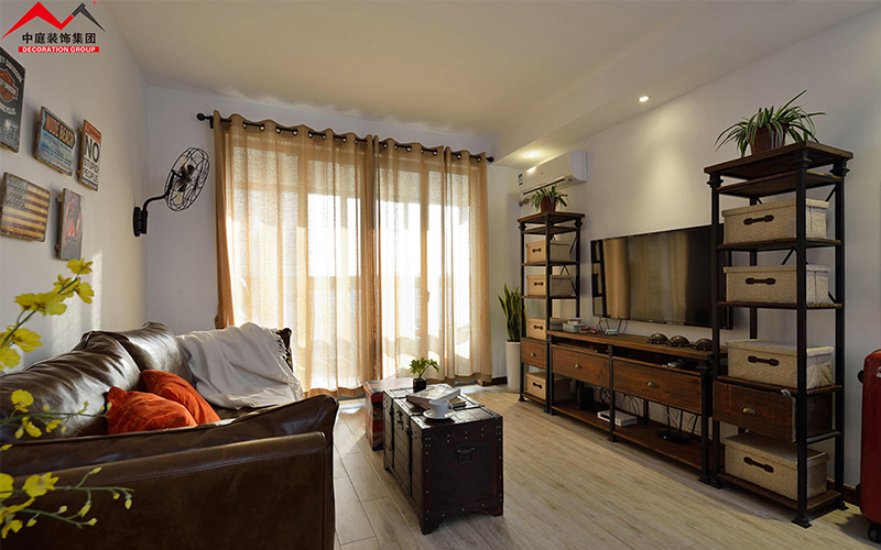 放眼望去客廳采光通透,電視兩旁除了放收納箱還起到了美觀的作用,而茶幾采用仿古箱,豐富了空間元素,也起到了美觀裝飾的作用。