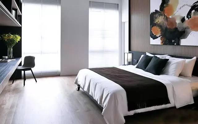 ▲床頭背景墻也被設(shè)計(jì)成木質(zhì)的,搭配衣服黑白的水墨畫后,別有一番意境。