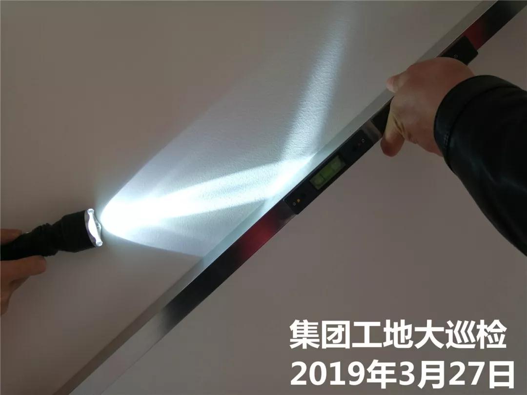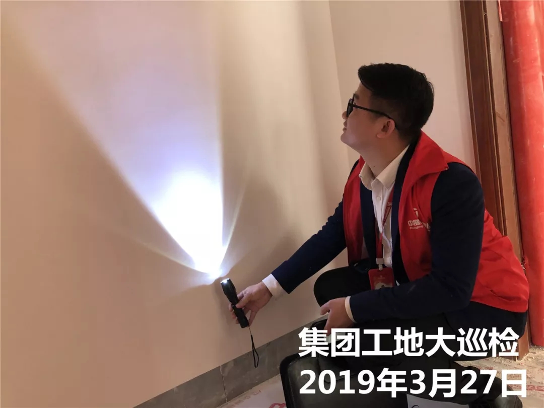 運(yùn)營部成云總經(jīng)理與張立安總經(jīng)理用強(qiáng)光手電筒檢查墻面膩?zhàn)邮┕?/span>
