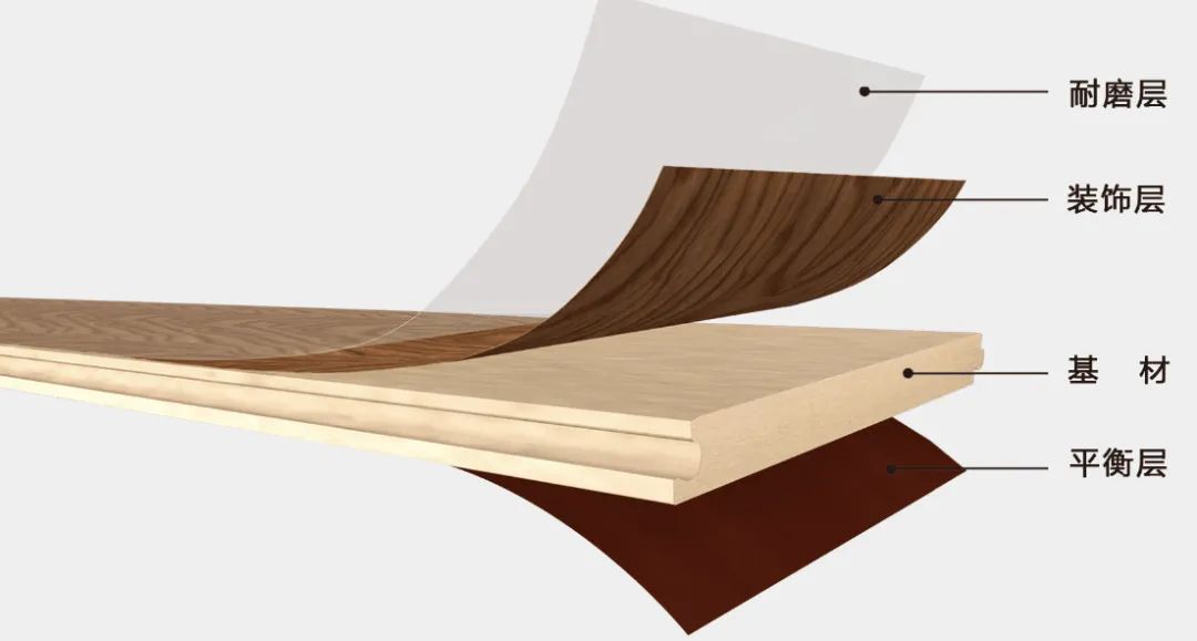 裝飾層印有木紋和其他優(yōu)美圖案,花紋十分豐富,而實(shí)木紋路自然多變;基材為密度板,密度板密度越大就越重,質(zhì)量也更好;底層(平衡層)屬防潮層,防止地板彎曲變形和受潮。