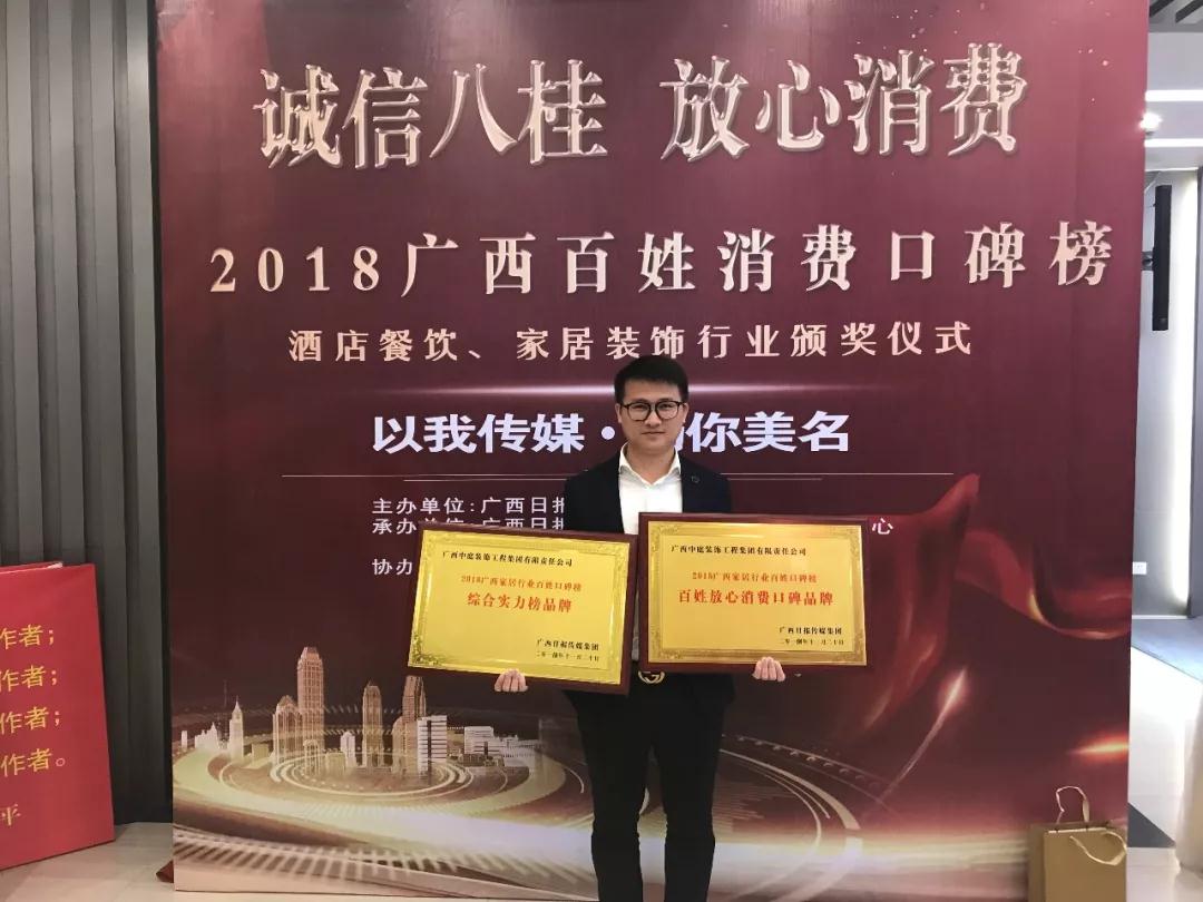 在2018廣西百姓消費口碑榜中,中庭裝飾集團(tuán)榮獲百姓放心消費口碑品牌獎綜合實力榜品牌獎”,由南國早報副總編輯趙永勝南國早報副總編輯鄧志勇為其頒獎。