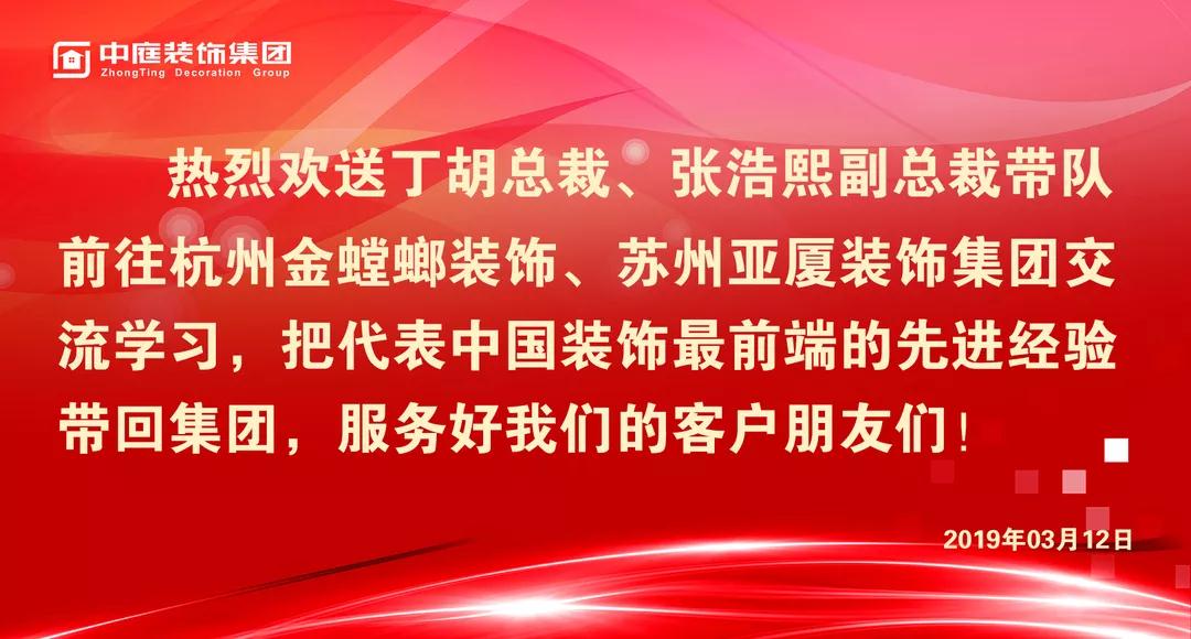 2019年3月12日,集團(tuán)總裁丁胡、副總裁張浩熙帶隊(duì)前往杭州金螳螂裝飾、蘇州亞廈裝飾集團(tuán)交流學(xué)習(xí)。