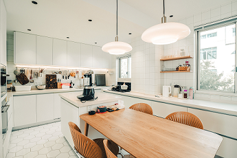 和諧統(tǒng)一的色彩與獨(dú)特的空間布局,塑造出干凈純粹,簡練又美的空間氛圍。再次然家里人都很喜歡烹飪,廚房是家庭的核心,經(jīng)常做飯洗碗時都會有兩個人以上一起操作。這個方案很好的解決的業(yè)主的一系列需求