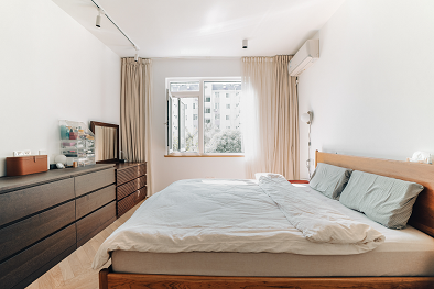 主臥整體用色與風(fēng)格延續(xù)整體原木色系,木地板配木色家具,色調(diào)素雅,加上簡潔而現(xiàn)代的軟裝陳設(shè),白色的棉麻窗簾讓室內(nèi)的氣氛柔和而溫馨