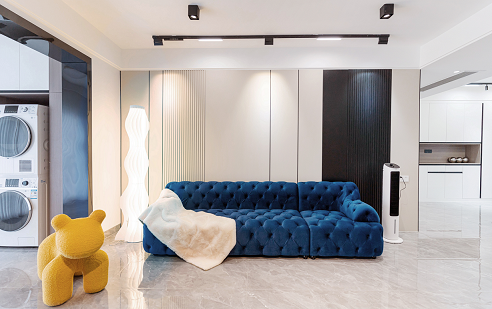使用更親近自然的棉、麻、木搭配黑、棕、白、灰色,在裝飾上極度的克制,給人高品質(zhì),舒服的感受。削弱復(fù)雜造型和色彩對(duì)人情緒的影響,反而產(chǎn)生了治愈的力量??巳R因藍(lán)沙發(fā)的點(diǎn)睛之筆,顯得整個(gè)空間更加自信,給人傳遞高級(jí)的視覺感受。